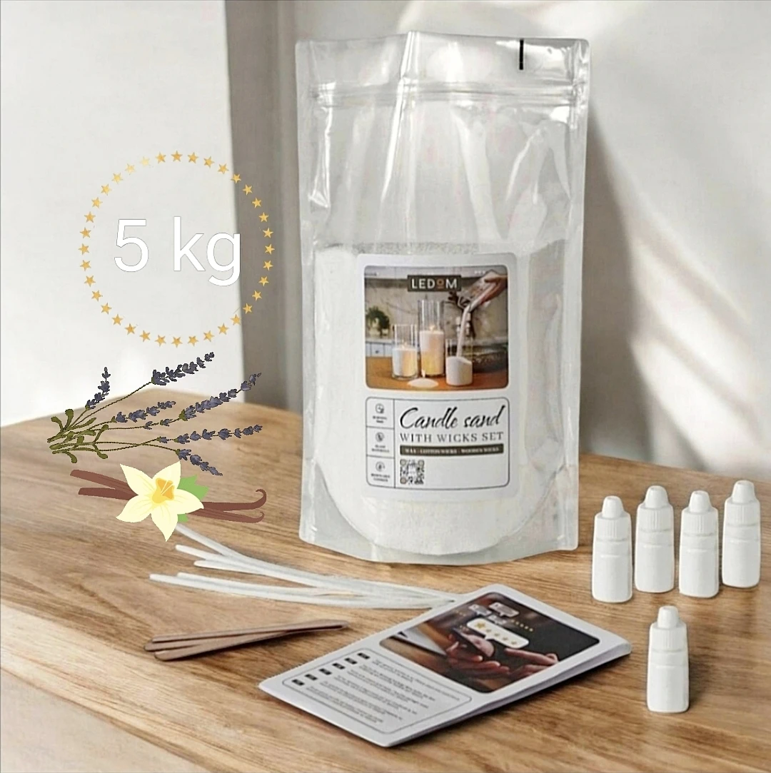 Im Set mit Kerzensand sind pflanzliches Perlenwachs und 25 mit Wachs getränkte Baumwolldochte enthalten. Jeder Docht hat eine Länge von 20 cm. Sie können den Docht selbst auf die gewünschte Länge schneiden, je nach gewünschter Brenndauer. Außerdem können Sie ätherische Öle verwenden, um einen Duft hinzuzufügen. Es reicht aus, ein paar Tropfen in einem Abstand von etwa 2 cm vom Docht aufzutragen, und Ihre Perlenkerze wird duftend